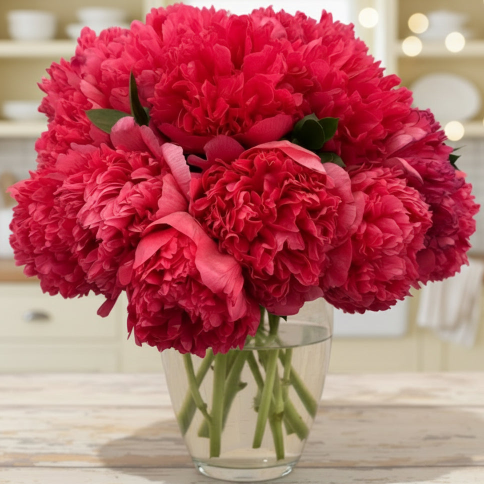 A stunning peony with huge fragrant flowers that emerge as red bombs, before brightening, and then fading as they mature, through salmon to orange and, eventually, pale cream. This sought-after cut flower variety has a vase life of up to two weeks but is best with some support in the garden. Mid season. 75cm.