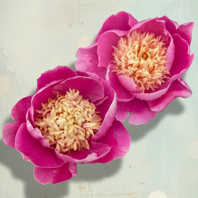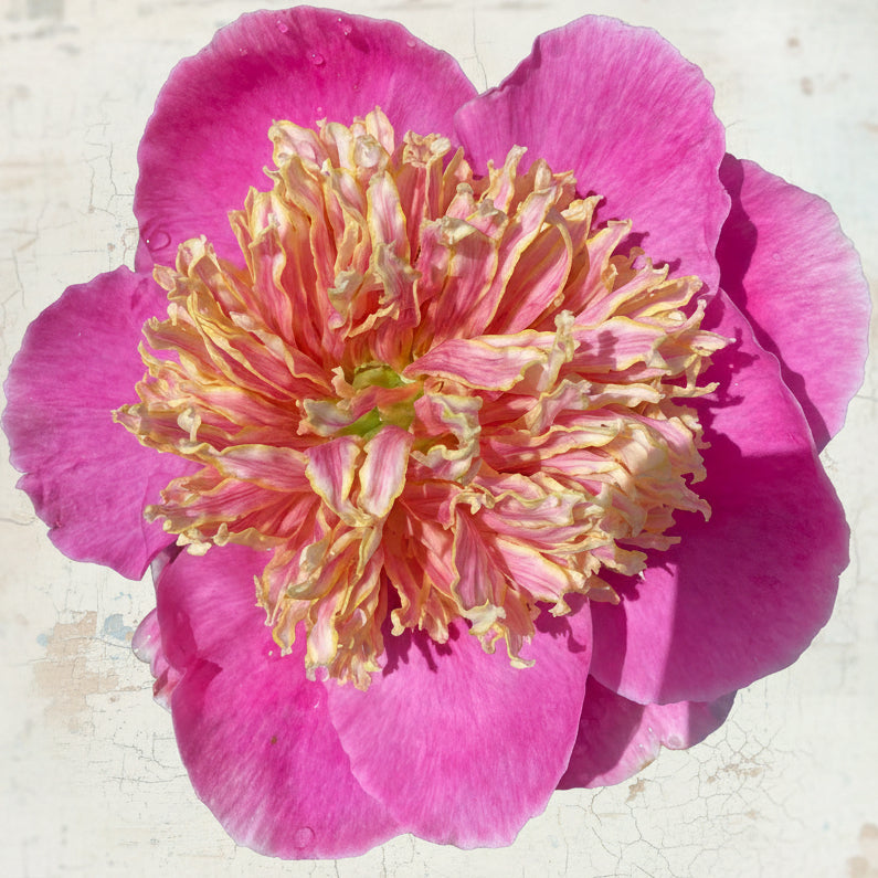 Very large, fragrant blooms consisting of silvery pink guard petals that unfurl to reveal an enormous pure gold centre, all displayed beautifully against attractive foliage. Flowering mid season, this charming heritage peony is of medium height and shows excellent vigour. 80cm.