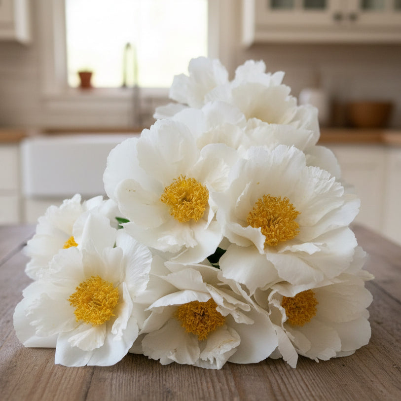 A splendid variety that has remained popular due to its vigour and reliability. With large, fragrant, semi-double flowers emerging from blush-coloured buds, and carried on top of strong stems, 'Miss America' is a great performer in the garden and holds up well in the vase. Awarded the American Peony Society's Gold Medal in 1956 and 1971. Mid-season. 90cm